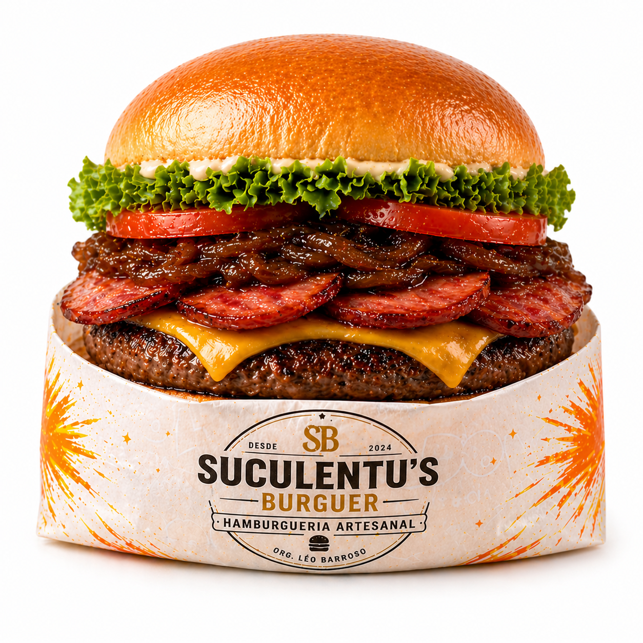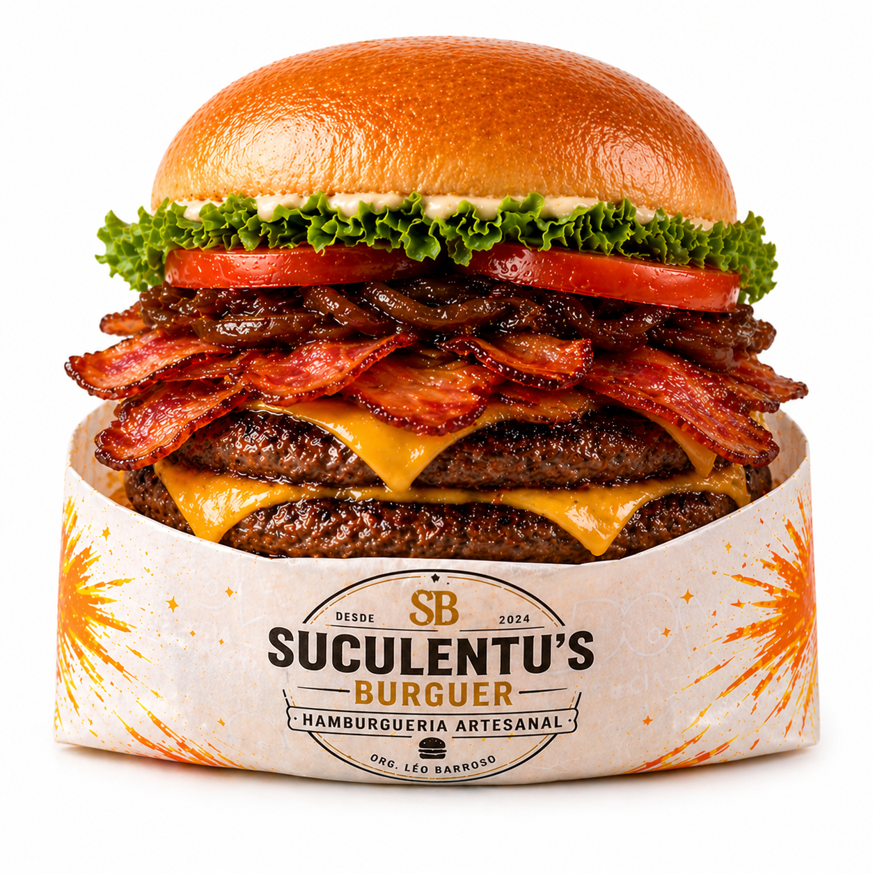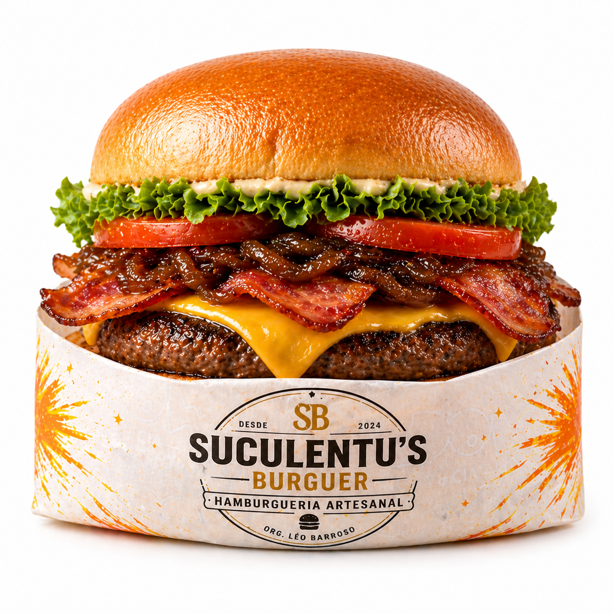 SUCULENTUS BACONPão, blend de carne de 130g, queijo, bacon, alface, tomate e cebola caramelizada.R$ 23,00