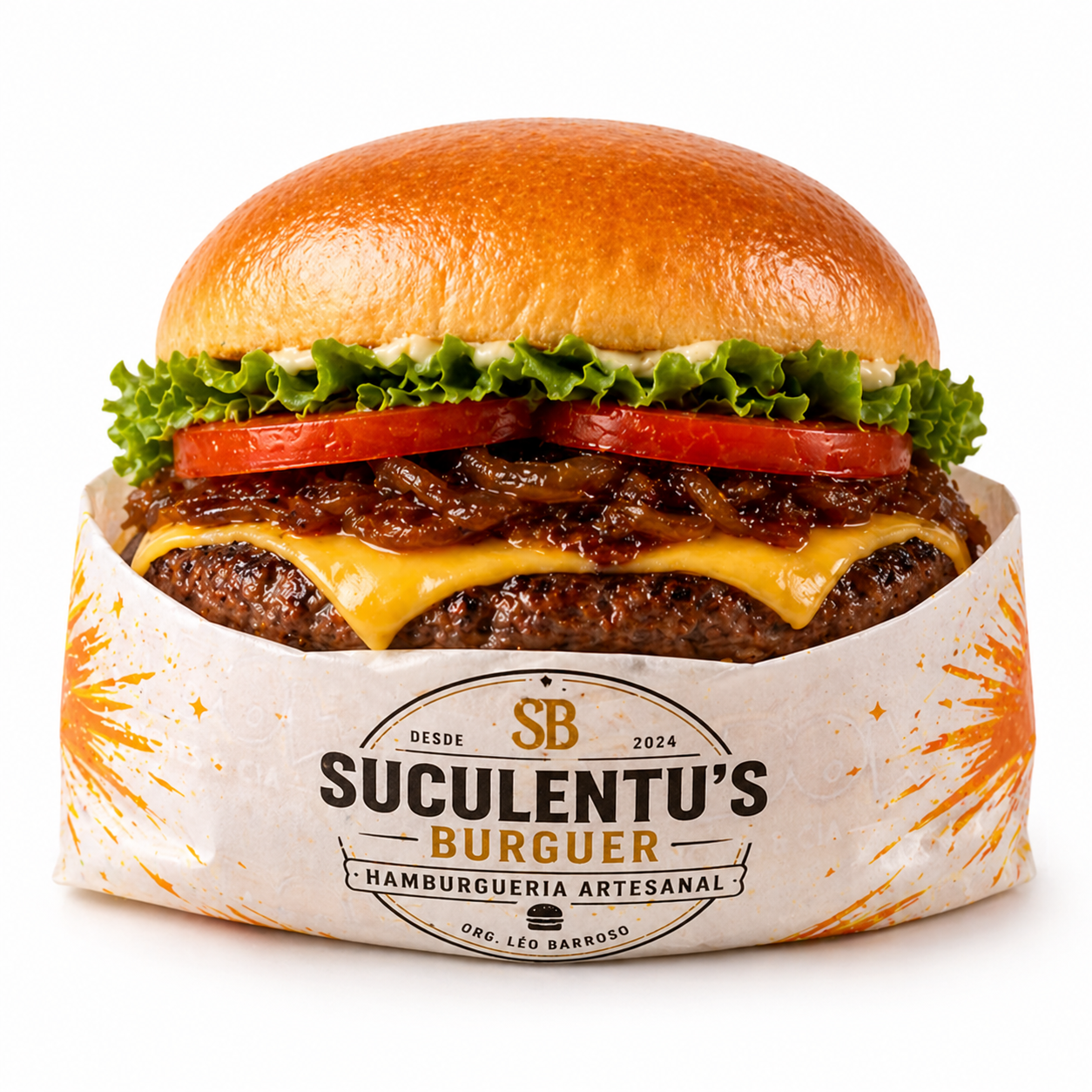 SUCULENTUS BURGERPão, blend de carne de 100g, queijo, alface, tomate e cebola caramelizada.R$ 19,00